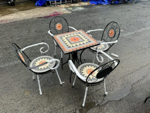 bộ bao gồm 1 bàn 4 ghế , bàn kich thước 60×60 cao 75 cm . ghế cao phần ngồi 45 cm . chất liệu khung sắt sơn tĩnh điện , mặt xi măng làm thủ công giả gốm